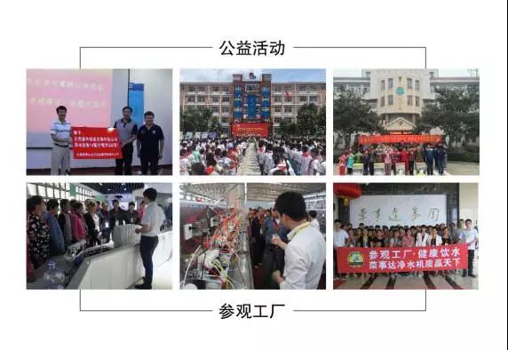 榮事達針對消費者對凈水機了解不足的問題,長期推出“參觀工廠”活動,讓消費者全面見證產品生產和質檢的流程,加強消費者對凈水機的種類、功能、技術的認知,引導消費者正確認識和選購凈水機。同時,關注弱勢群體,積極踐行公益,發(fā)起過“愛心傳遞 健康助學”等多項活動,在2015年攜手安徽省青年志愿者協(xié)會啟動“樂享凈水”大型助殘公益項目,榮獲安徽省志愿者服務項目大賽二等獎,號召并帶動更多愛心人士投入其中,樹立起公益典型,該活動已在安徽、湖北、湖南、江蘇、江西、河南、山東、陜西、廣西等多個省份,為400多個助殘機構及殘疾人士家庭提供公益服務,捐贈、安裝凈水設備1500多套,開展各項幫扶活動、健康飲水知識講座500余次,受惠殘疾人口超過30000人;日前,為全國首個希望小學——金寨縣希望小學免費提供了直飲水設備,發(fā)起“給山區(qū)孩子一杯水”援建金寨中小學生凈水設備公益活動,解決山區(qū)孩子飲水難題。