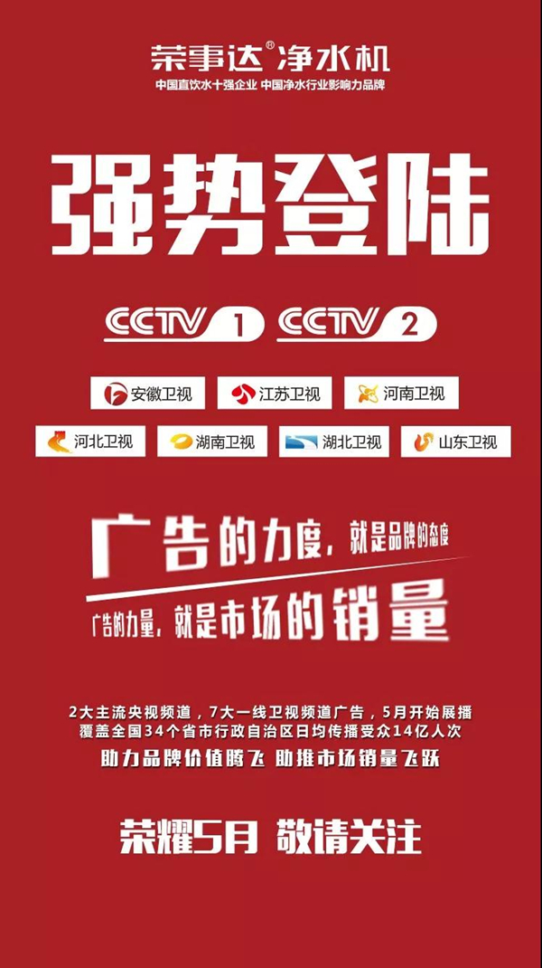 記者了解到,5月下旬,榮事達凈水機2018廣告新片將率先登陸CCTV1、CCTV2兩大央視平臺,屆時將向全國觀眾呈現(xiàn)榮事達獨特的精神理念與品牌形象。