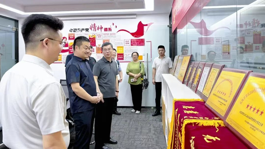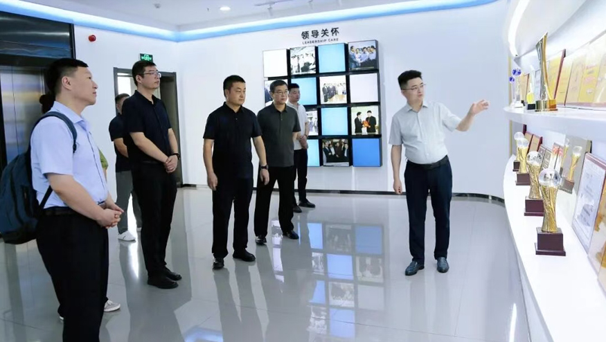 在智慧水世界展廳,總經理王悅生向領導一行詳細介紹集團的發展歷程、公益貢獻及黨建引領下的企業文化等。